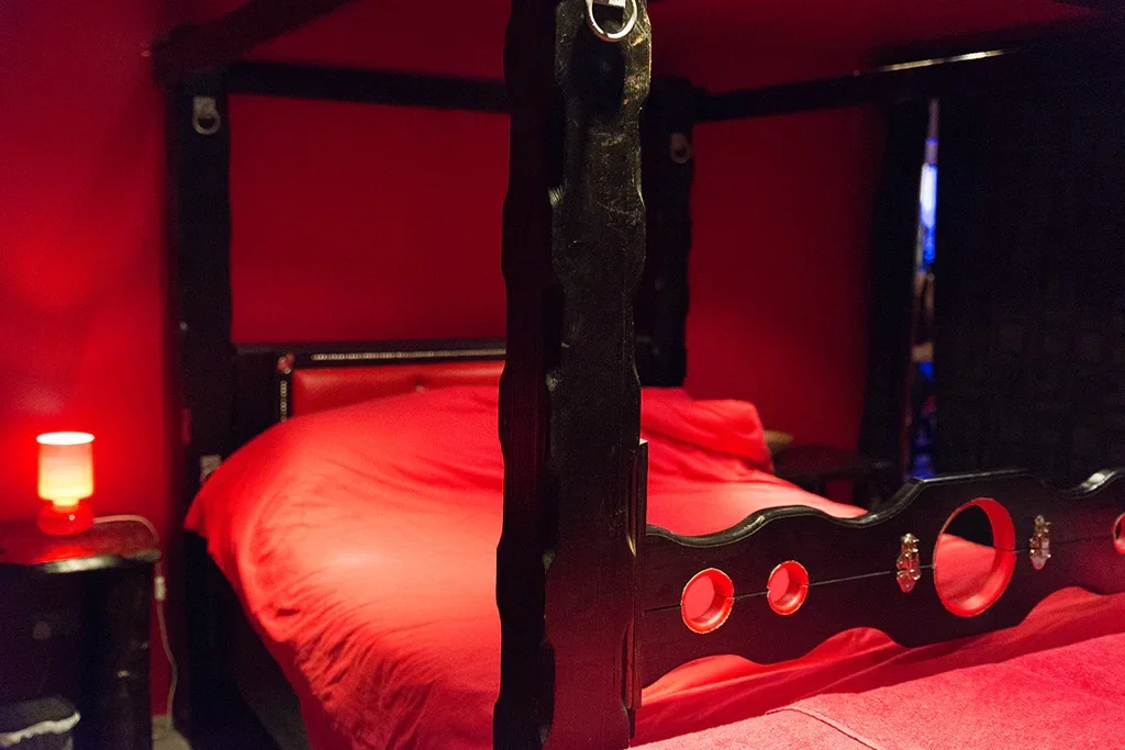 Al entrar, la atmósfera cambia: una iluminación tenue y precisa proyecta halos suaves y sombras dramáticas sobre las suntuosas superficies. Maderas oscuras, metales pulidos y terciopelos suntuosos se mezclan en armonía. Correas de cuero, sujeciones, bancos, jaulas y otros elementos están listos; cada pieza ha sido seleccionada con atención tanto a la estética como a la función. Cada detalle susurra una intención: desde el agradable sonido de la pesada puerta hasta el suave eco de pasos lejanos, cada matiz está diseñado para intensificar la concentración, la anticipación y la entrega.